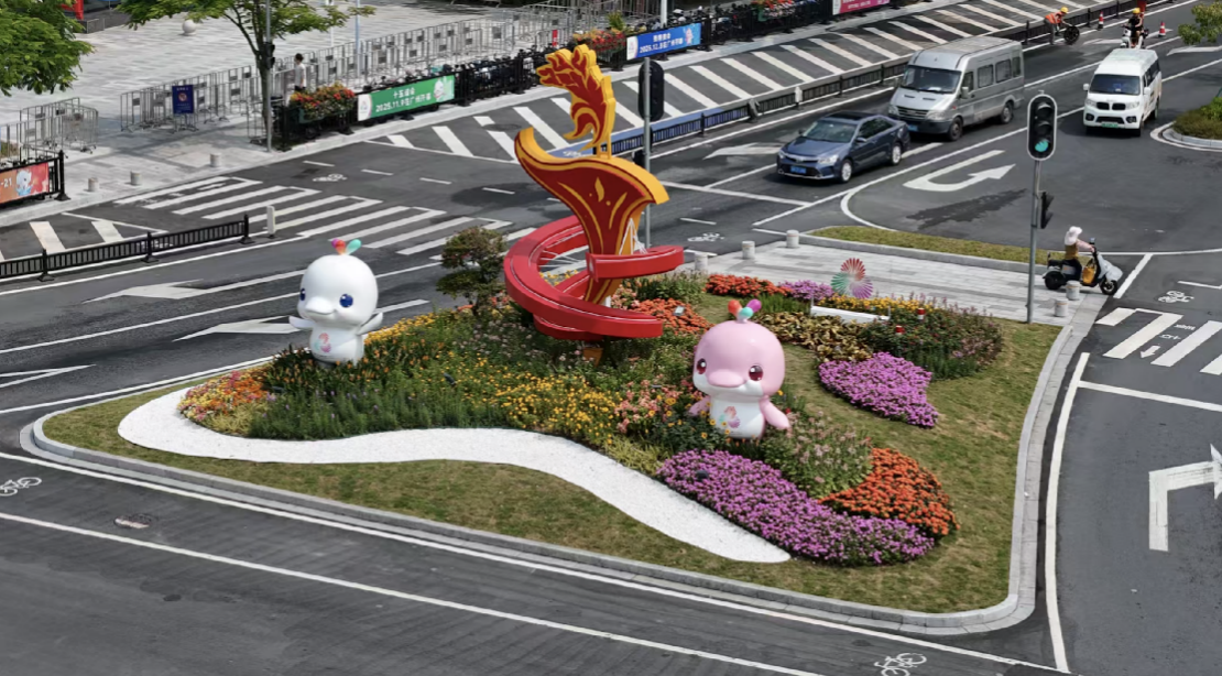 清晨的奥体南路上,刚结束晨跑的陈女士在慢行道上缓步行走。不远处,立交桥披上崭新涂装,立体花坛与花带交织成一幅美丽的生态画卷,体育盛会的氛围拉满。